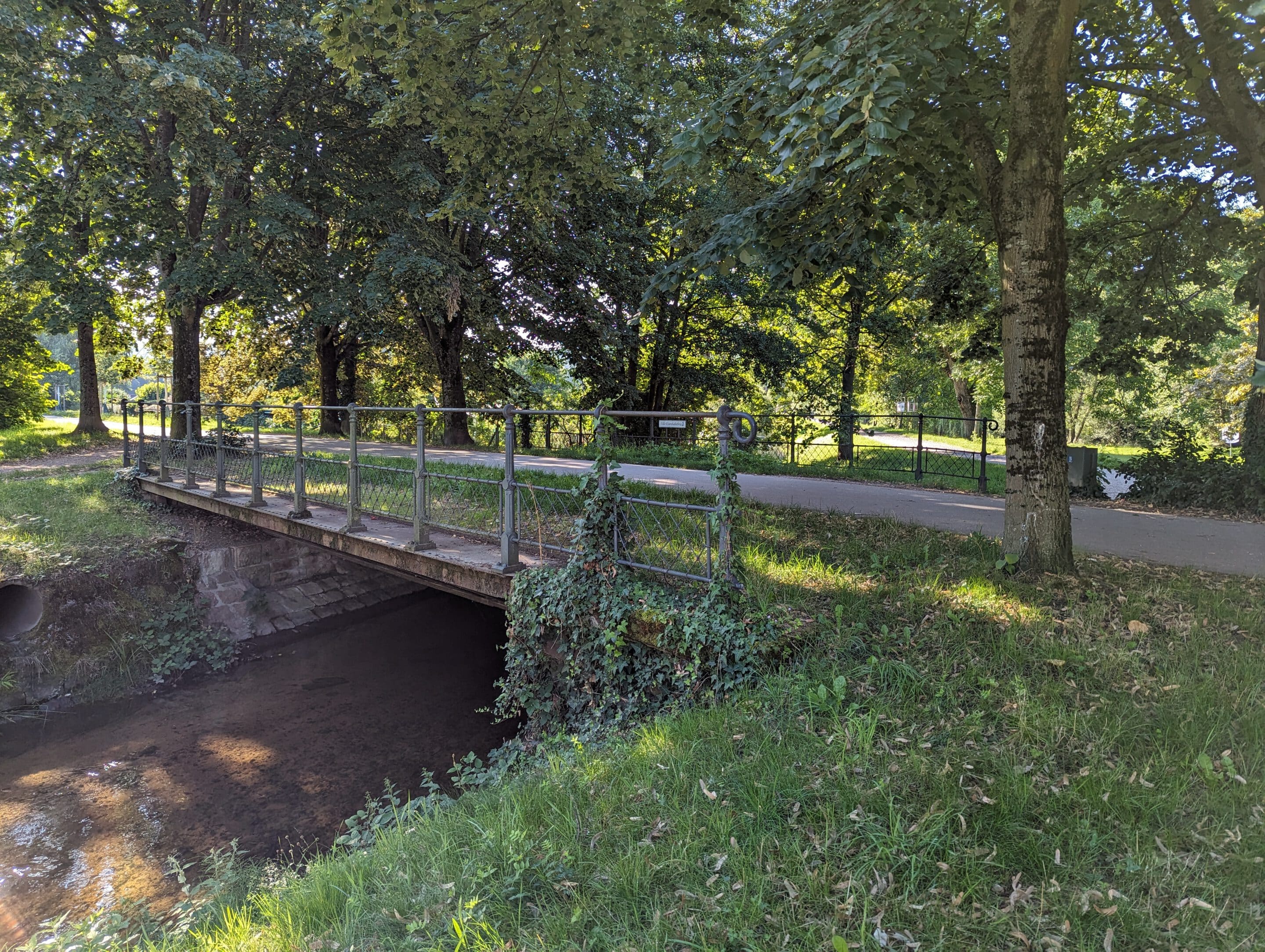 Fotos: Bahnbrücke der Alten Stichbahnstrecke nach Baden-Baden über den Ooser Landgraben im Wörthböschelpark in Baden-Oos (August 2023)