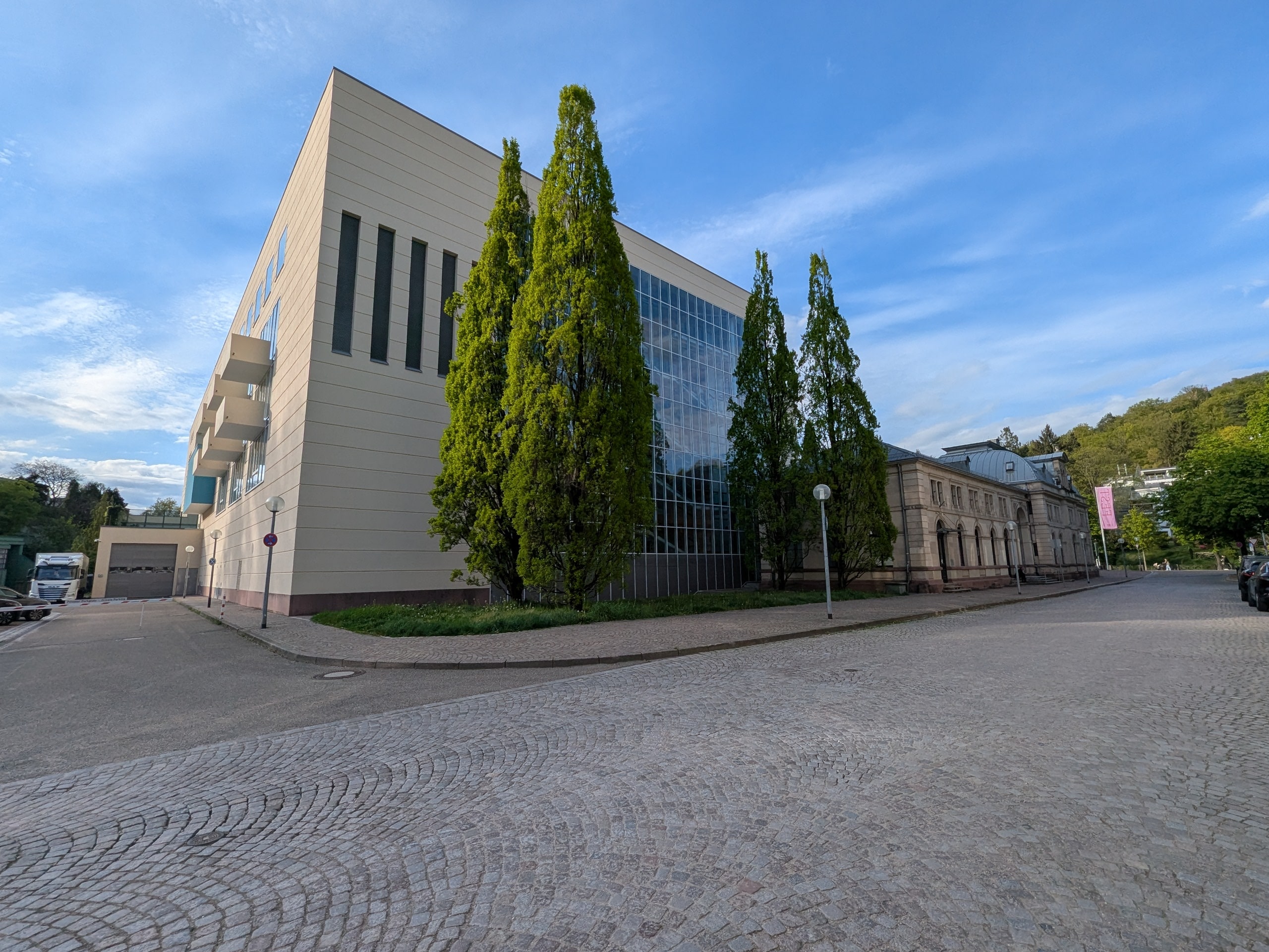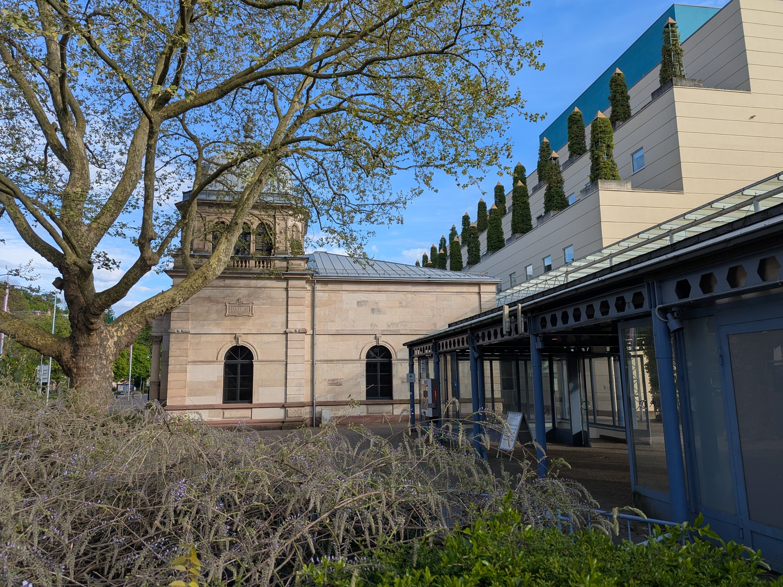 Das Festspielhaus an der Rückseite des Empfangsgebäudes des ehemaligen Stadtbahnhofes von Baden-Baden (April 2026).