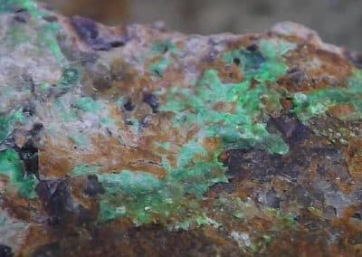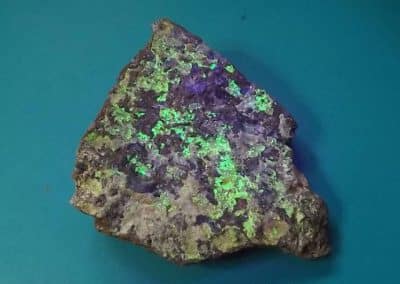 Konzentriert man sich nun auf die Steine auf denen viele feine, leicht grünliche Kristalle auf der Oberfläche zu sehen sind, kann man mit einem Geigerzähler eine Ortsdosisleistung von deutlich über 15 µSv/h messen. Mit einer UV-Lampe erkennt man schnell, dass diese grünlichen Kristalle hell aufleuchten, wenn man sie im Dunkel der Bäume mit UV Licht bestrahlt. Diese Fluoreszenz ist das Merkmal der Uranglimmer, wie z.B. der Mineralien Autunit und Uranocitrit. Etwas seltener findet man auch Steine mit schwarzgrauen Einlagerungen in den sonst rötlichen Steinen, die den Geigerzähler sofort an die Alarmgrenze treiben. Hier handelt es sich mit hoher Wahrscheinlichkeit um Uraninit (Uranoxid, UO2 bzw. U3O8) oder auch im Volksmund Pechblende genannt, das Mineral, dem die vorrangige Begierde der bergbaulichen Aktivitäten hier galt.