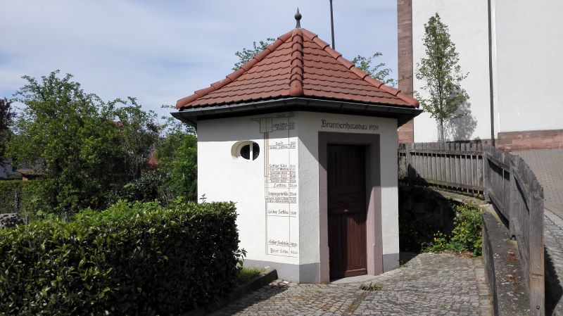 Bohrbrunnen der Familienbrauerei Bauhöfer (ehemals „Ulmer“) in Renchen-Ulm aus dem Jahr 1929 mit schematischer Darstellung des Bohrprofils.