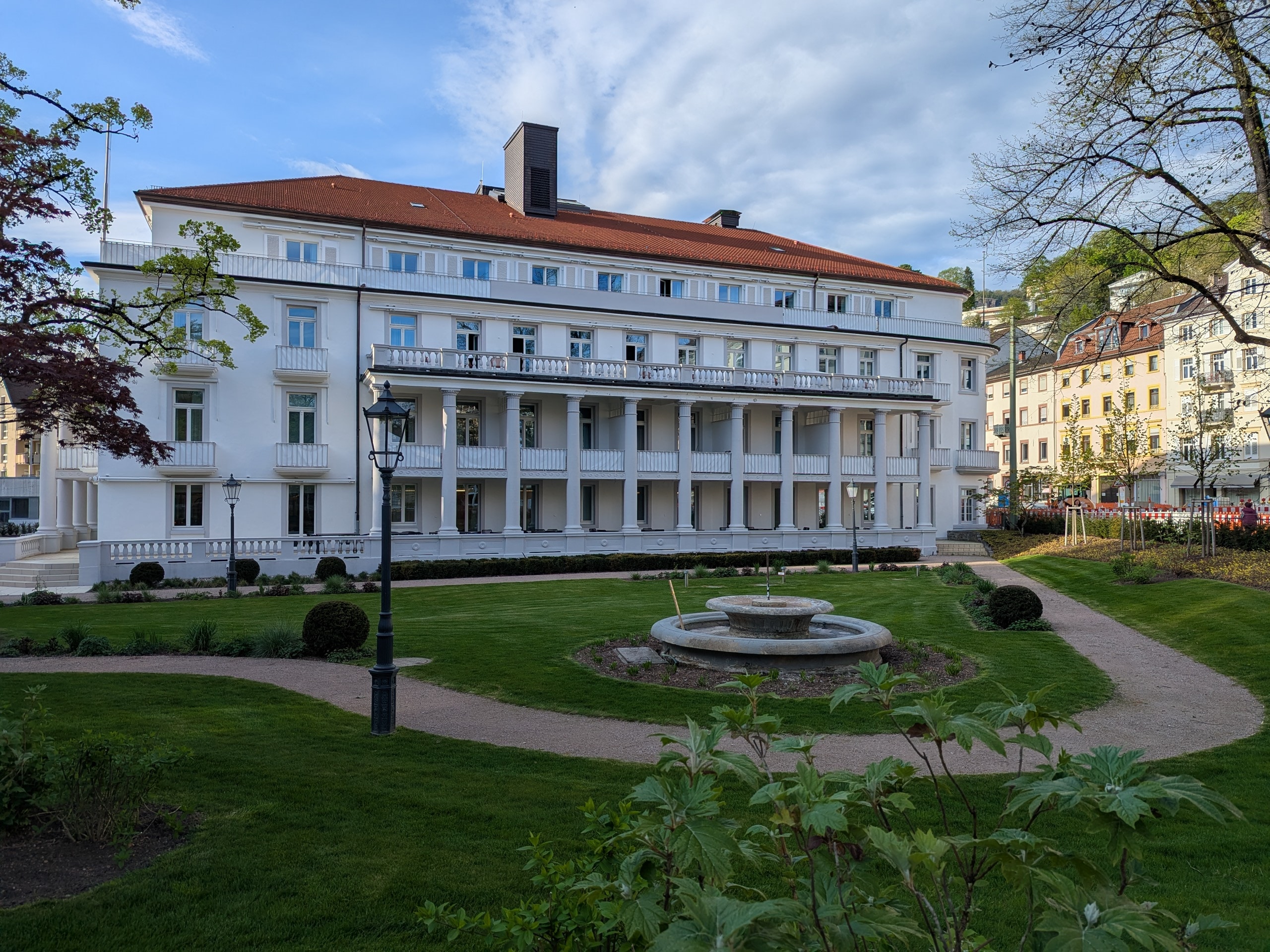 In leicht erhöhter Lage erinnert der Bau mit seinen 16 Säulen und dem 90 m langen offenen Wandelgang an die römische Geschichte Baden-Badens.