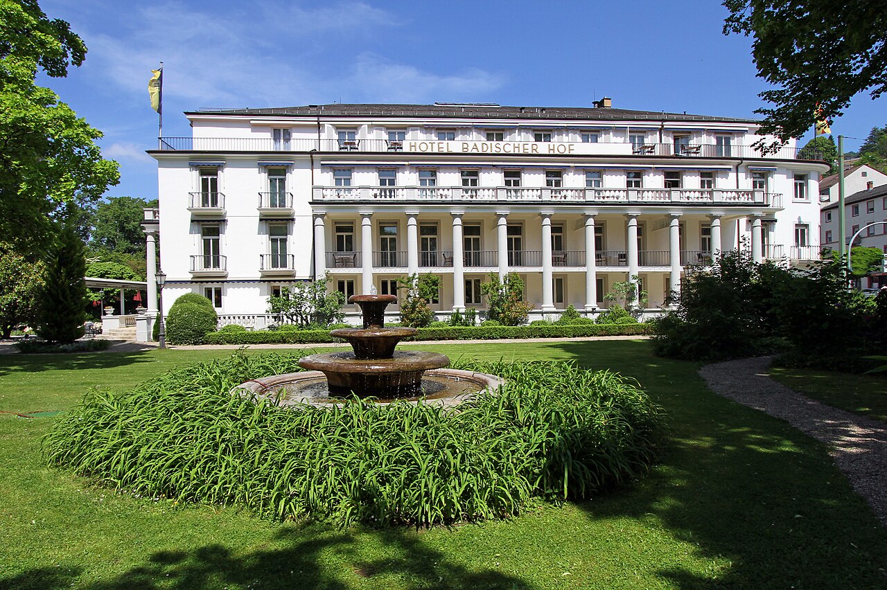 Der Badische Hof vor und nach dem Brand 2021, der eine Komplettsanierung des Hotels erforderte.